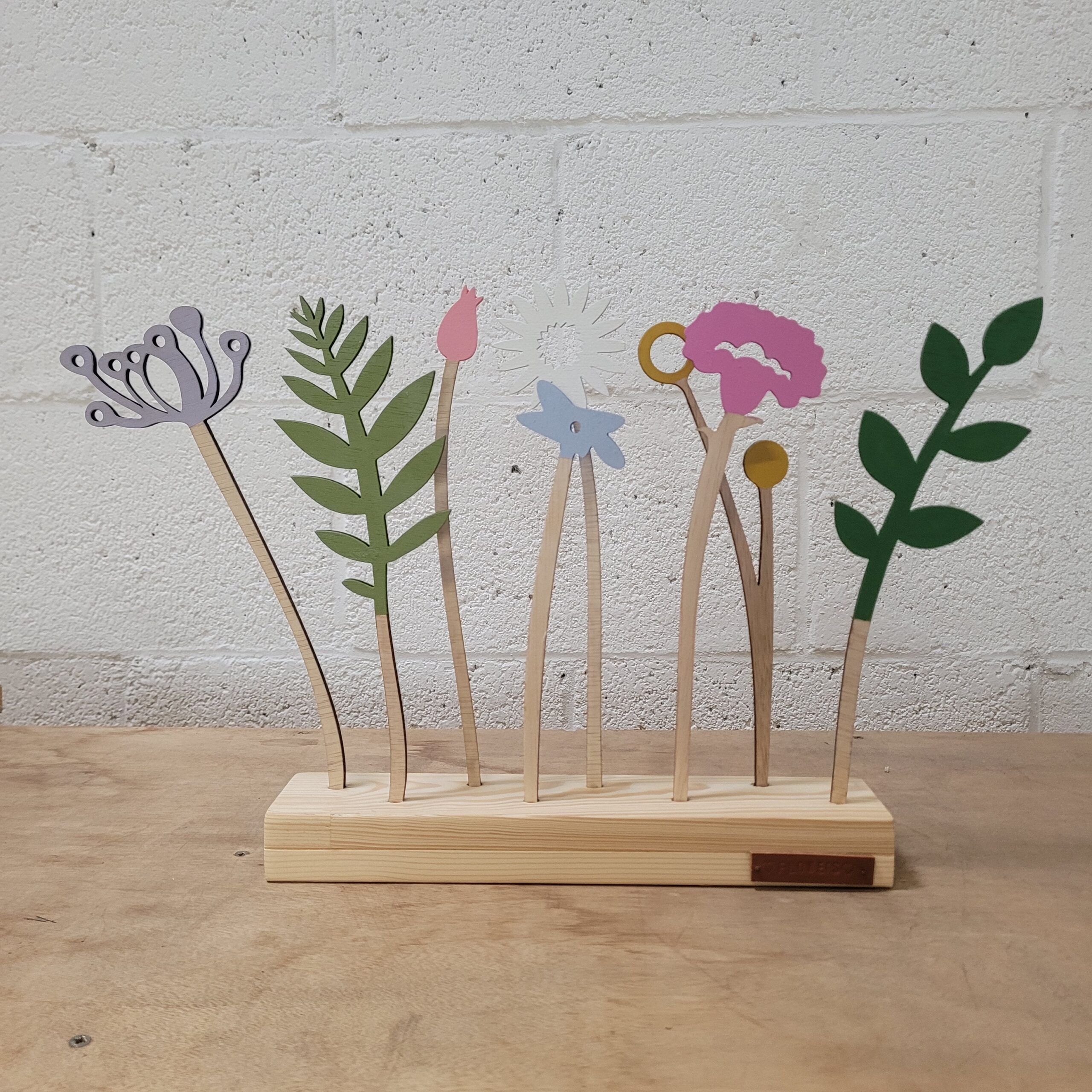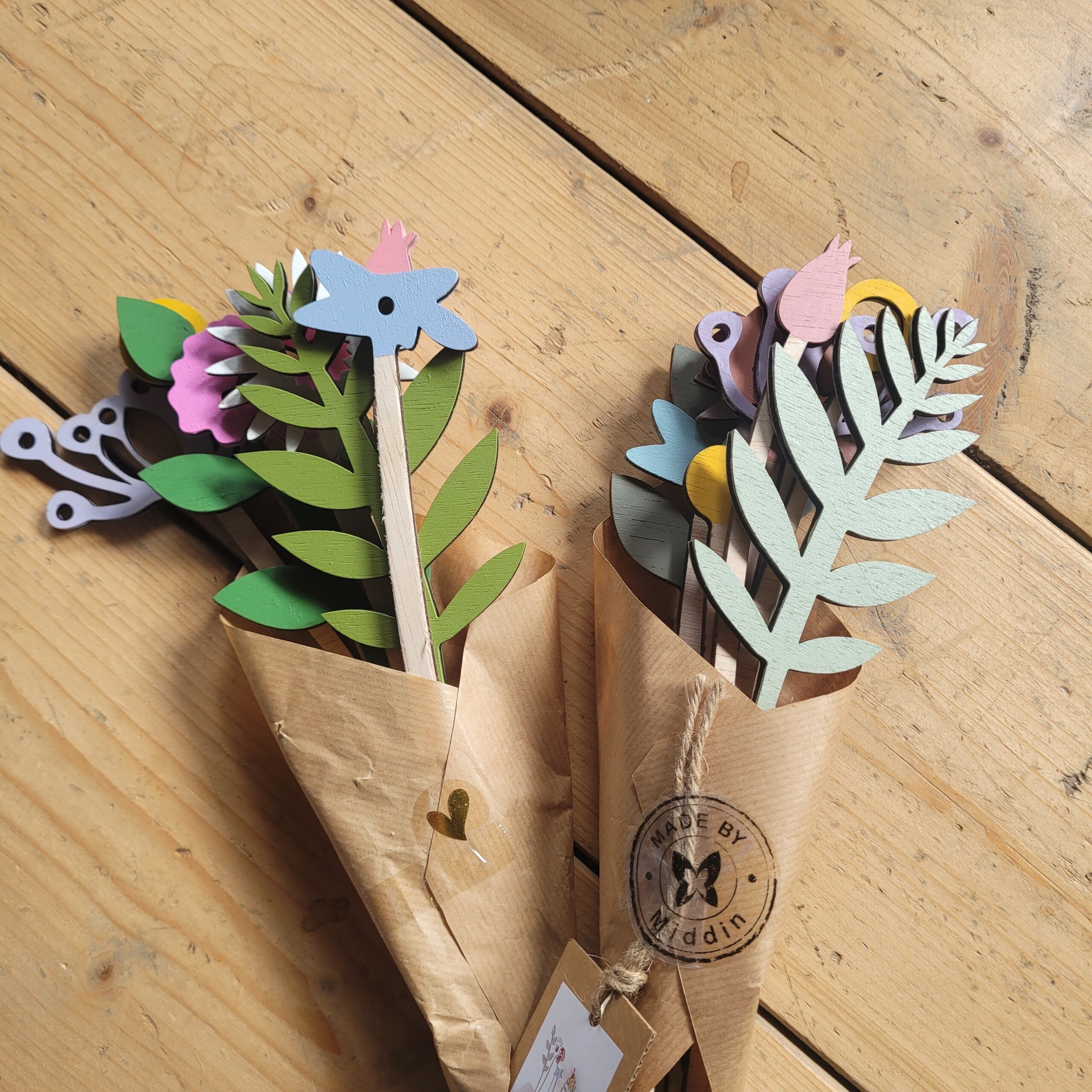 Een prachtig boeket houten bloemen, die op elke plek in huis tot zijn recht komt. je kunt de bloemen zelf schikken zoals je mooi vindt. De bloemen en het houten blok zitten in een doos die door de brievenbus past. Er is ook een klein boeketje op een ronde standaard en een mini boeketje op blok, super leuk als kleine attentie om op te sturen.